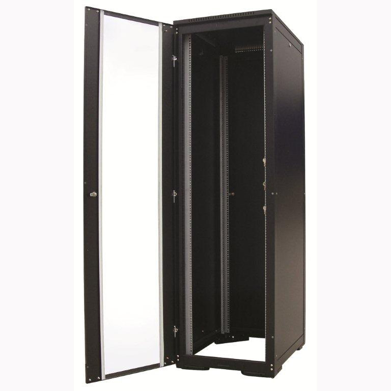 High quality free standing cabinets supplied complete with: • 19” mounting angles fitted to horizontal mounting channels, providing front and rear movement • Steel rear door • Lockable framed glass front door • Lockable quick release (lift off) side panel