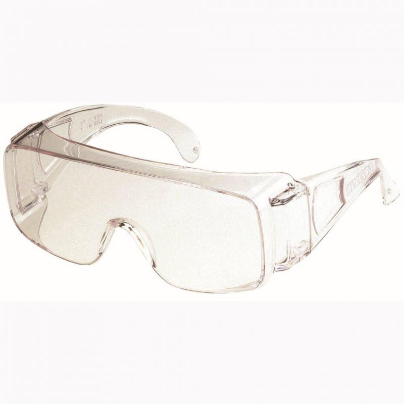 A spectacle type eyeshield with a rigid plastic frame and two folding side arms.