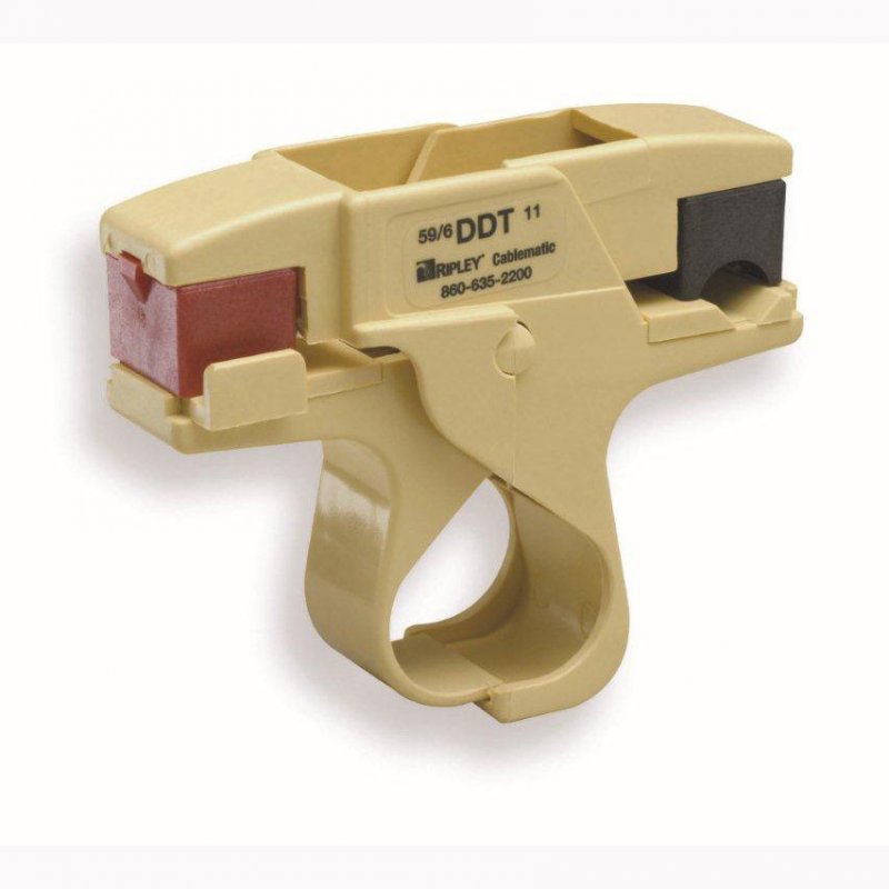 One step, small, lightweight stripper for preparation of RG59, 6 & 11 coax cable. It precisely exposes the center conductor by 5/16” (7.93 mm) and removes the proper length of jacket at 1/4” (6.35 mm) without any adjustment or changing blade cassette.