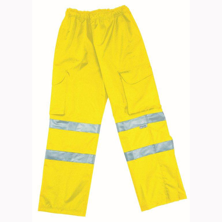 A high visibility over-trouser made from PU coated Polyester with elastic waist and cord adjuster, 2 large Velcro fastened cargo pockets, side pocket access and lower leg zip opening. Manufactured to full spec EN471 Class 1, EN343 3, 1.